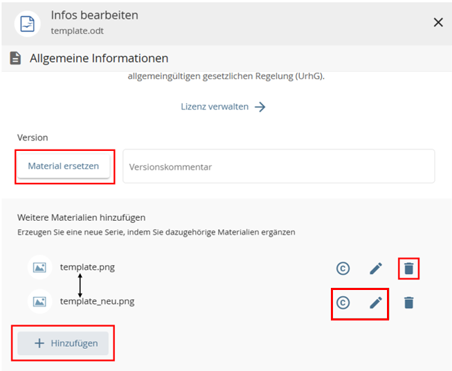Sie benötigen ein „Hauptobjekt“, d.h. eine Datei, die die ganze OEROpen Educational Resources (OER), auf Deutsch offene Bildung More repräsentiert. Diese laden Sie ganz normal ins System und vergeben die Metadaten. Diesem Hauptobjekt können Sie im Dialog „Infos bearbeiten“ im Abschnitt „Weitere Materialien hinzufügen“ um weitere Dateien oder Links ergänzen. Die so ergänzten Materialien bilden zusammen mit dem Hauptobjekt eine Serie und haben zunächst die gleichen Metadaten. Titel, Lizenz und Urheber der Serienelemente können jedoch bei Bedarf individuell angepasst werden. Dazu nutzen Sie die Symbole neben den Materialnamen im Dialogfenster. Ebenso können die einzelnen hinzugefügten Materialien dort auch wieder gelöscht werden. Die Reihenfolge der Serienelemente können per Drag&Drop bei den kleinen Icons vor den Materialnamen geändert werden.